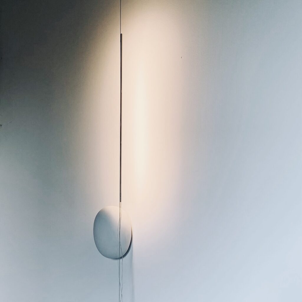 Thin | Light is a subtle, thin LED line that visually divides its own light shape on the wall in two. Silent, vertical light as you see in the natural phenomenon “Lightpillars”. The ultra-thin LED line hangs from a steel wire and is height adjustable.